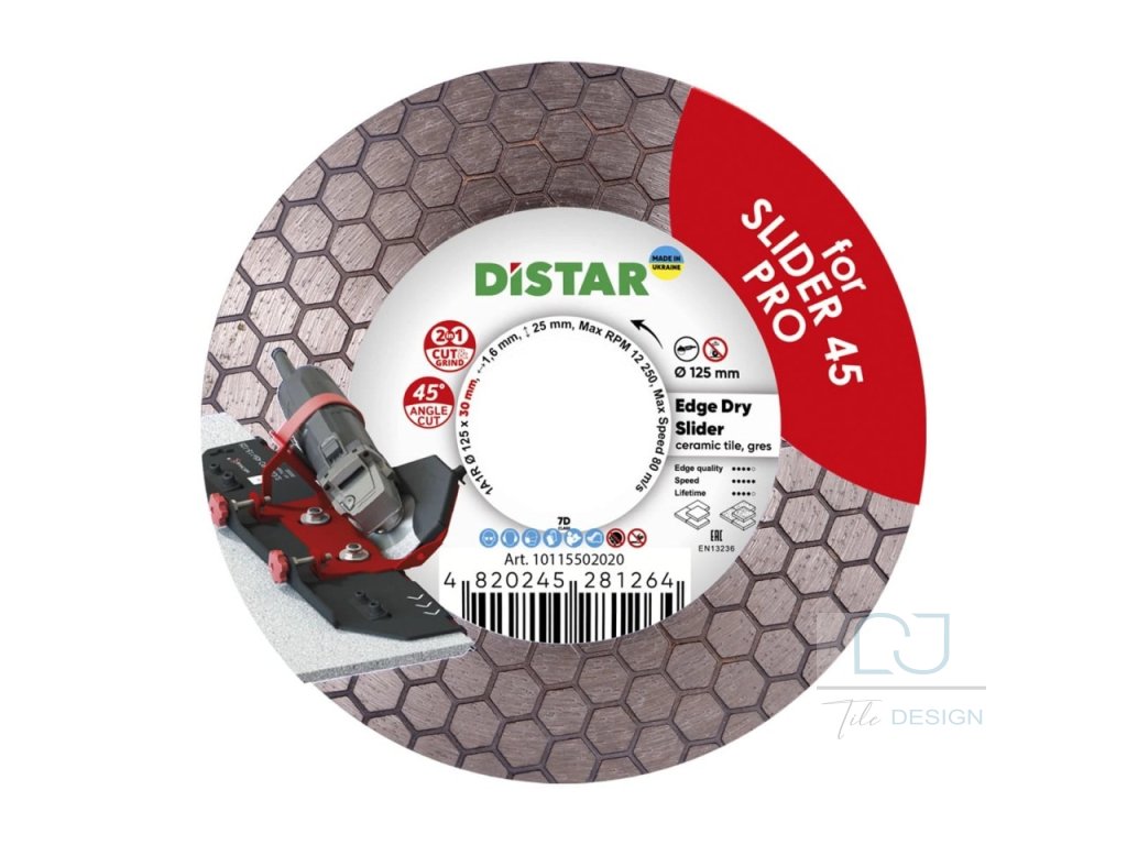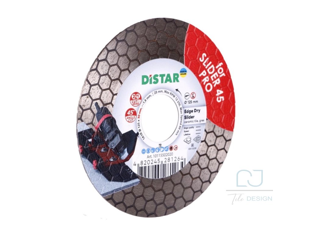 The EDGE DRY SLIDER Professional 45° is a professional diamond blade engineered as an analogue to the standard EDGE DRY blade, but modified exclusively for use with the professional Slider 45 PRO cutting system. It is designed for maximum precision, speed, and clean performance when cutting 45° bevels on porcelain stoneware and hard ceramic tiles.